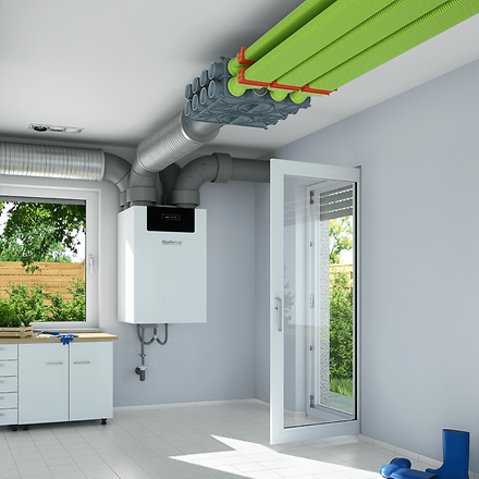 - Buderus propose deux systèmes de conduits flexibles en plastique pour la distribution d'air qui, après une planification détaillée par l'installateur, sont posés de manière invisible soit dans la structure du sol sous la chape, soit sous le plafond suspendu, soit dans le plafond en béton.